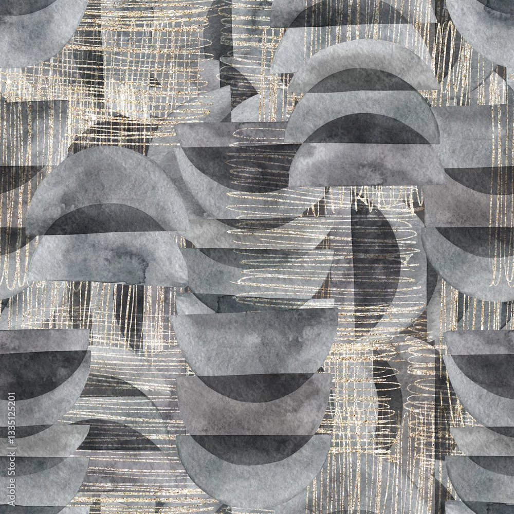 Abstract print with golden and geometric elements on grey background. Watercolor seamless pattern. Hand drawn illustration. Mixed media art