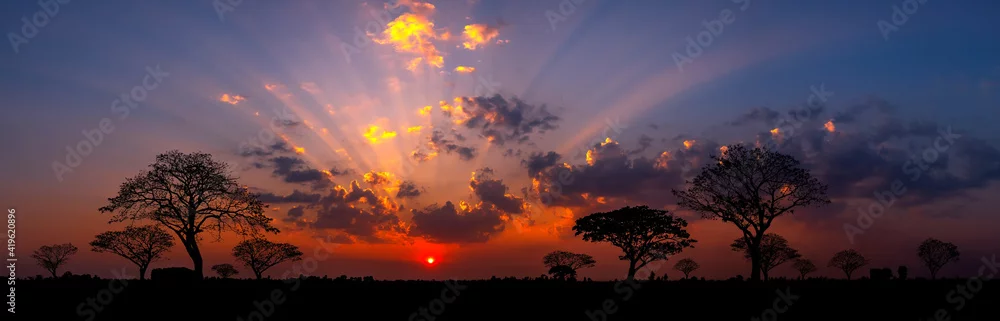 Panorama silhouette tree in africa with sunset.Tree silhouetted against a setting sun.Dark tree on open field dramatic sunrise.Typical african sunset with acacia trees in Masai Mara, Kenya