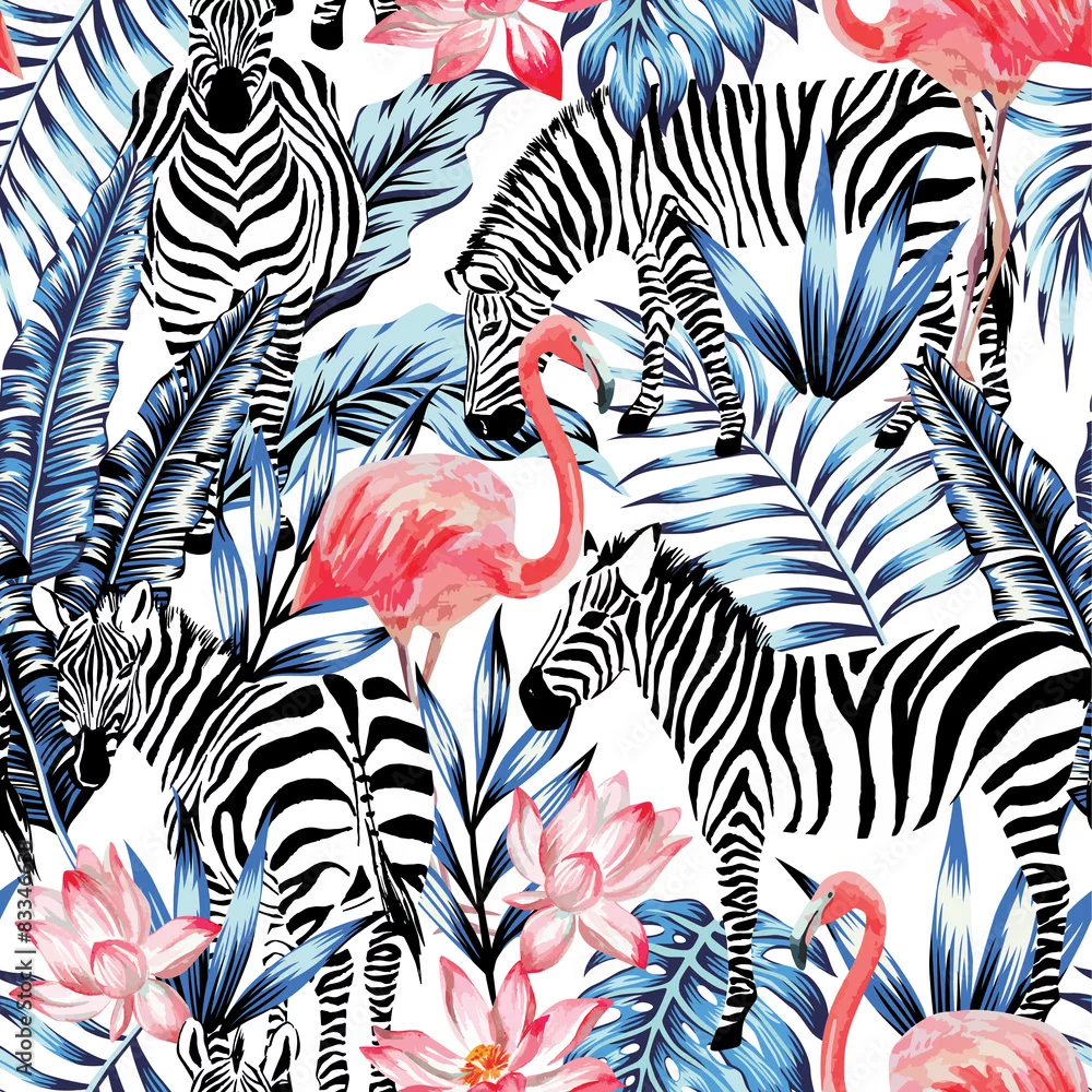 Fototapeta samoprzylepna akwarela flamingo, zebra i liście palmowe tropikalny wzór - Picturewall.pl