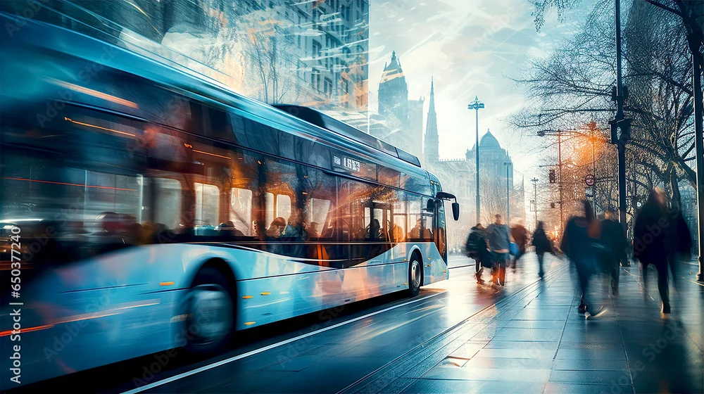 Fototapeta samoprzylepna City bus motion blur with beautiful traffic lights and reflections. Commuting and city life concept