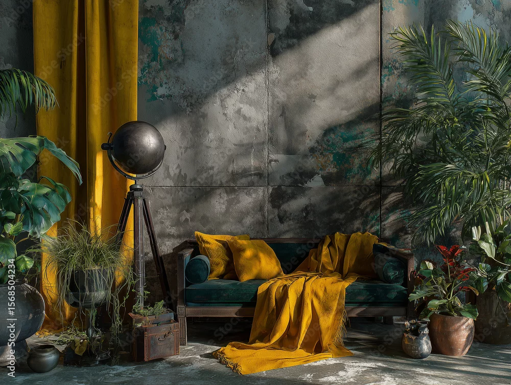 Fototapeta samoprzylepna Aranżacja wnętrza z egzotycznym charakterem: zielona sofa z musztardowymi poduszkami i kocem, dopełniona licznymi roślinami. Surowa ściana z efektem betonu.