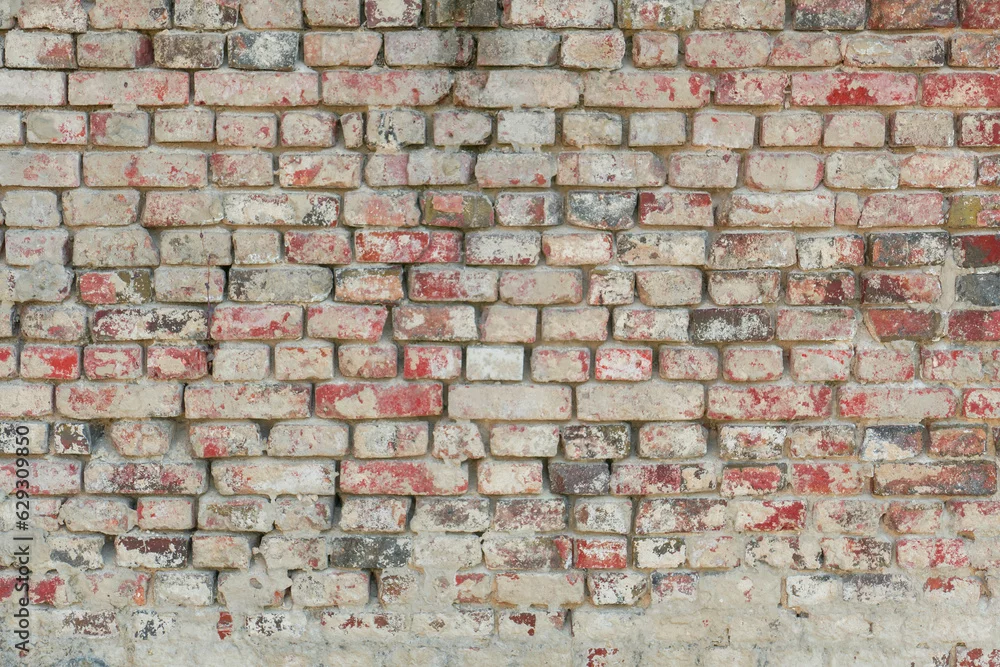 Fototapeta samoprzylepna Zdjęcie przedstawiające teksturę utworzoną przez cegły ułożone w równych rzędach w murze. Cegły częściowo pokryte są zaprawą murarską. Stanowią one element starej budowli.