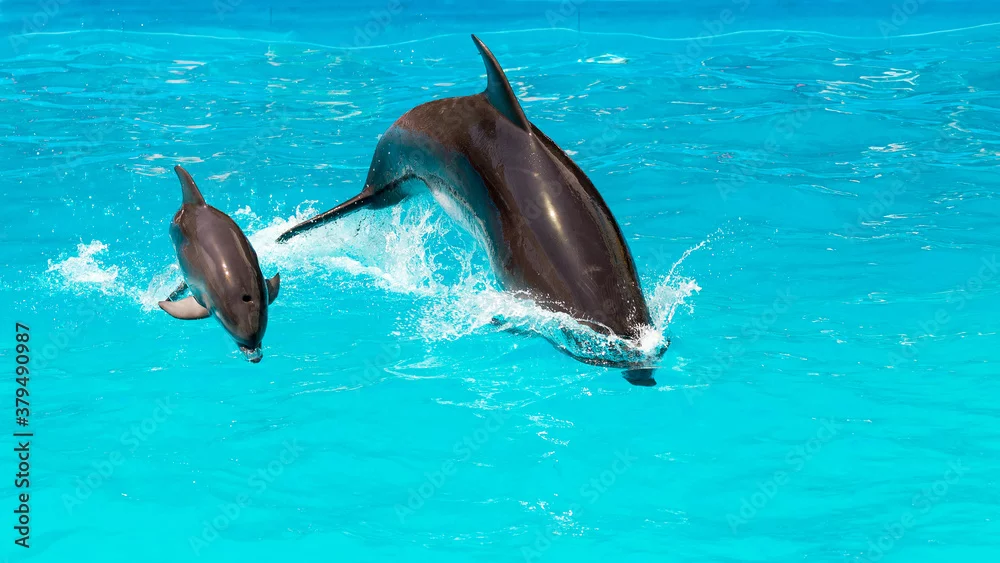 Fototapeta samoprzylepna A charming dolphin baby swims with his mom dolphin in pool. Two dolphins enjoing together. Dolphin with cub swim in the pool..