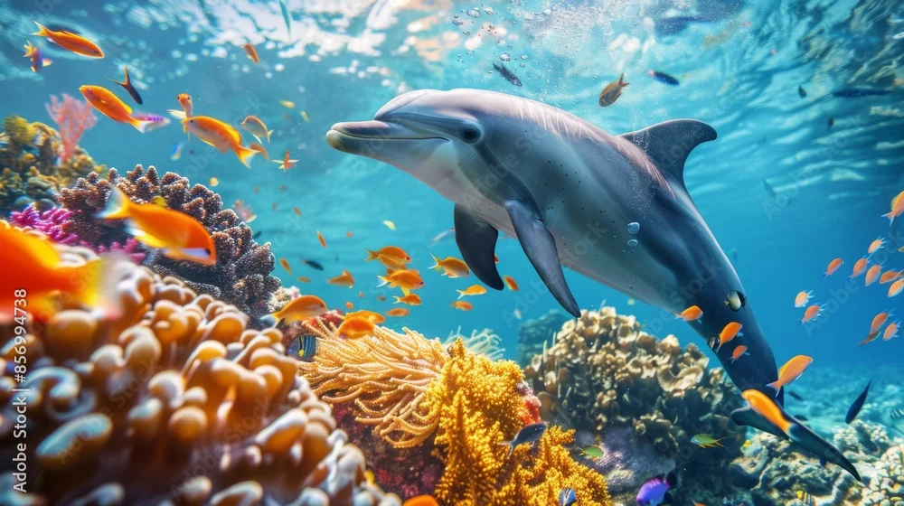 Fototapeta samoprzylepna A dolphin swimming near a coral reef, surrounded by colorful fish and vibrant underwater scenery.