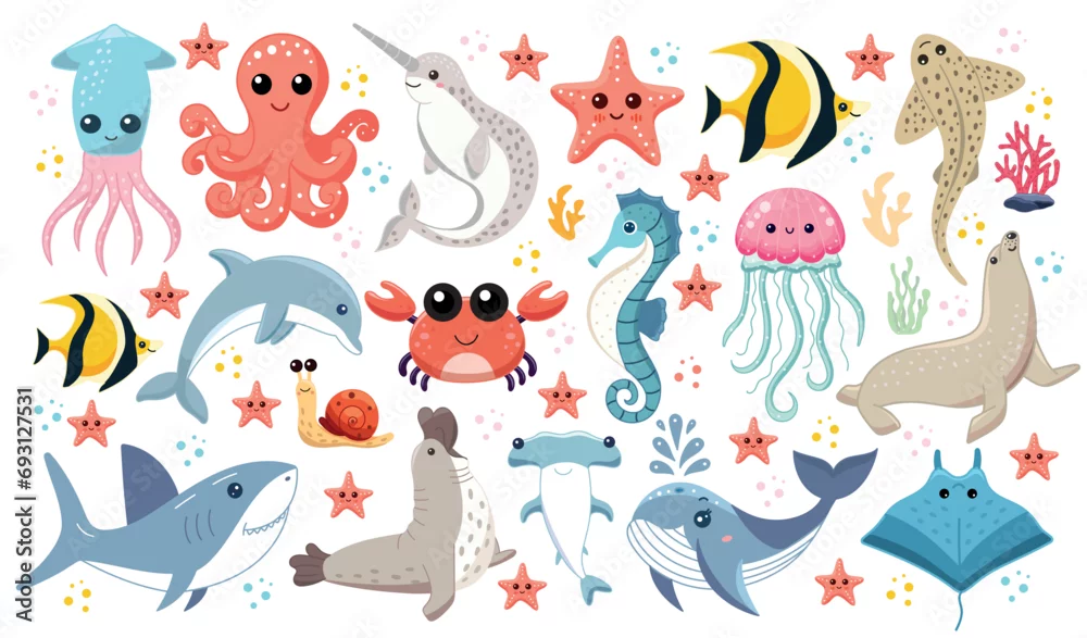 Cute sea animals, set of illustrations with aquatic inhabitants of the ocean, octopus and narwhal, starfish and yellow fish, dolphin and crab, seahorse and jellyfish, blue whale and squid