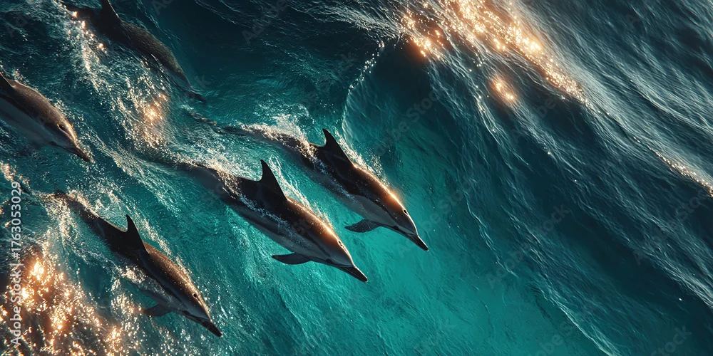 Fototapeta samoprzylepna School of dolphins swimming gracefully in the ocean under the bright sunlight