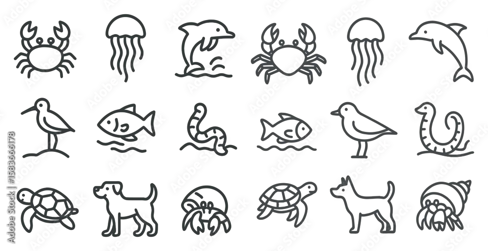 Fototapeta samoprzylepna Series of animals in a line, including a dog, a cat, a turtle, a bird, a fish, a crab, a jellyfish, and a dolphin