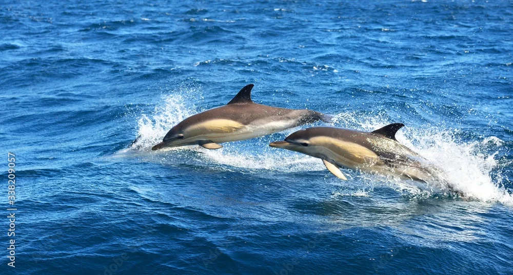 Fototapeta samoprzylepna Two dolphins jumping in the Mediterranean sea on a clear day, the striped dolphin (Stenella coeruleoalba) close-up. Waves and water splashes. A view from the sailing boat. Spain