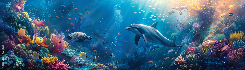 Vibrant underwater scene featuring a dolphin and sea turtle amidst colorful coral reefs and diverse marine life bathed in sunlight.