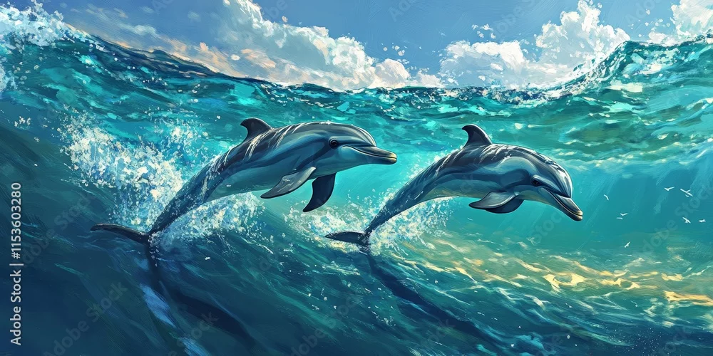 Fototapeta samoprzylepna Wild dolphins gracefully swimming in a vibrant blue ocean, showcasing the beauty of marine life, with wild dolphins elegantly leaping above the crystal clear waters.