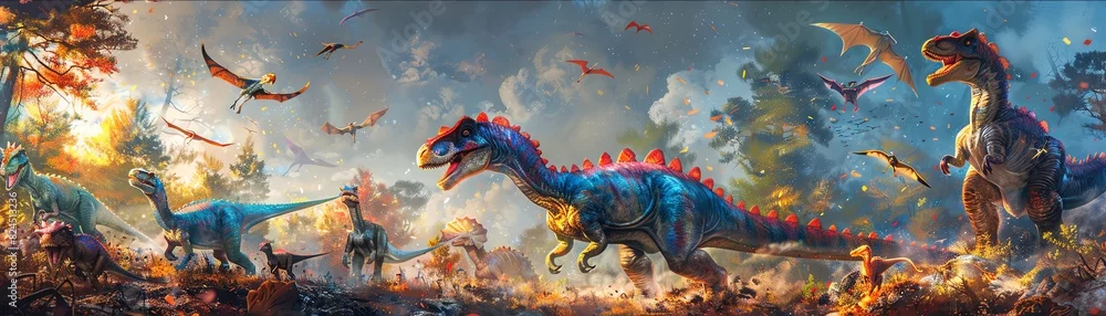 Fototapeta samoprzylepna A birthday celebration with a dinosaur cake featuring a playful scene of baby dinosaurs hatching, colorful and detailed, joyful atmosphere, Digital Painting