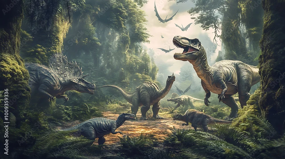 Fototapeta samoprzylepna A herd of dinosaurs roam a lush prehistoric jungle, with a Tyrannosaurus Rex in the foreground.