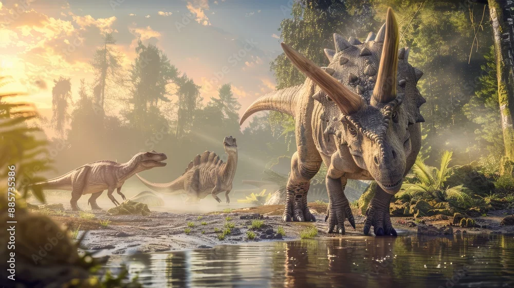 Fototapeta samoprzylepna AI-generated majestic dinosaurs in a prehistoric landscape. Triceratops. The concept of time when dinosaurs ruled the Earth.
