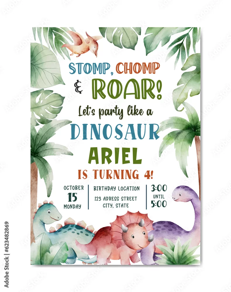Fototapeta samoprzylepna Birthday invitation card with dinosaur theme watercolor background template