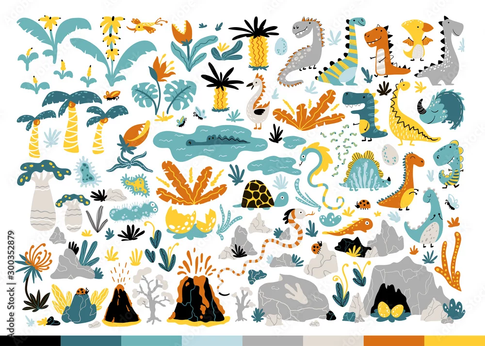 Dinosaur Set. Cute Dino and other fantastic elements of nature of the prehistoric period. Vector illustration in simple cartoon hand-drawn style.