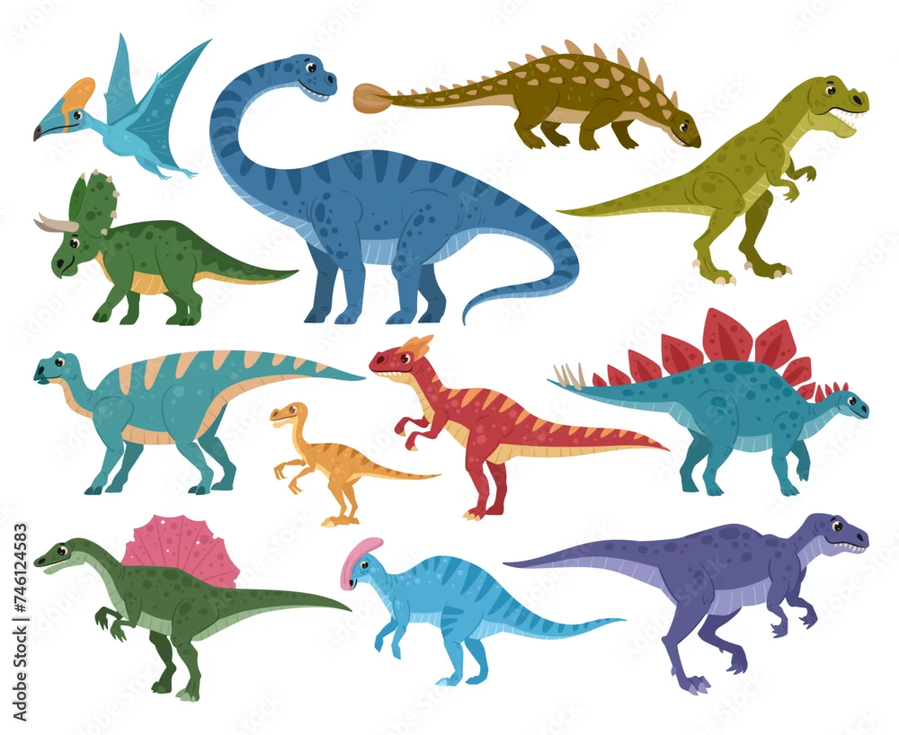 Fototapeta samoprzylepna Dinosaurs set. Cartoon ancient reptiles, jurassic predators and herbivores, t rex, cute diplodocus, pterodactyl, brontosaurus flat vector illustration collection. Prehistoric dinos
