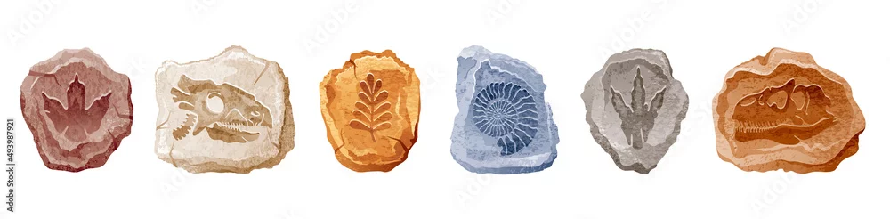 Fototapeta samoprzylepna Fossil vector. Archeologic fossil dig set. Dinosaur dino foot, sea animal, fish skeleton, plant, shell. Ancient stone. Evolution rock prehistoric art. Paleontology, history vintage dinosaur icon set