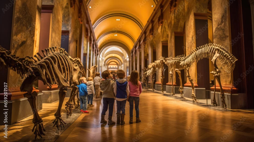 Generative AI, children, schoolchildren on an excursion to the prehistoric museum of paleontology looking at dinosaur skeletons, fossils, ancient lizards, education, architecture, boys, girls