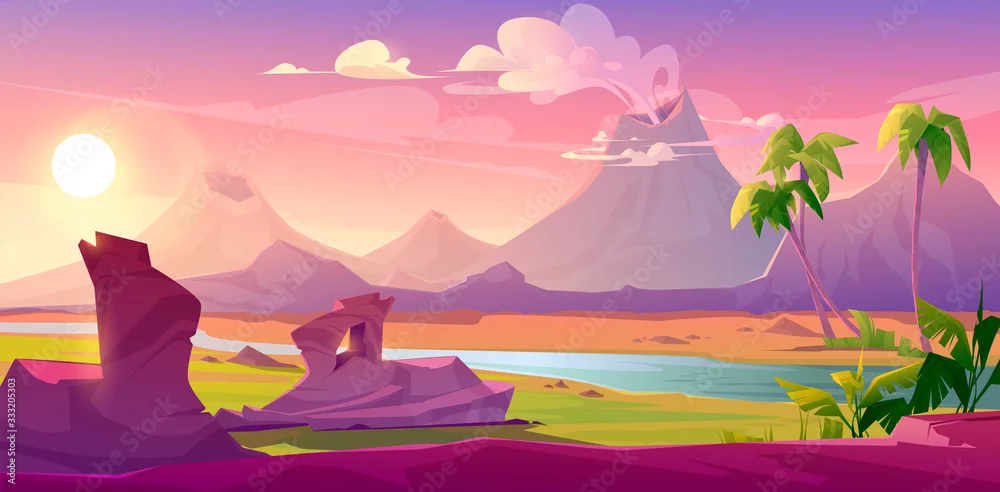 Fototapeta samoprzylepna Prehistoric steaming volcanoes, cartoon volcanic background with palm trees, river and rock under pink sky with shining sun. Jurassic era of Earth evolution, tropical landscape, Vector illustration