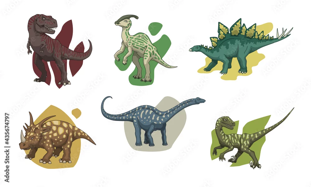 Fototapeta samoprzylepna Set of Dinosaurs with editable strokes, colors and shadows: Tyrannosaurus, Parasaurolophus, Stegosaurus, Styracosaurus, Brontosaurus, Velociraptor