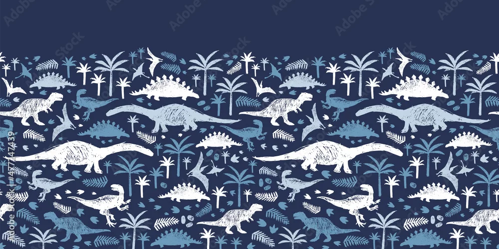 Fototapeta samoprzylepna Vector blue dinosaur sketch repeat horizontal border pattern. Perfect for wall mural, banners or posters.