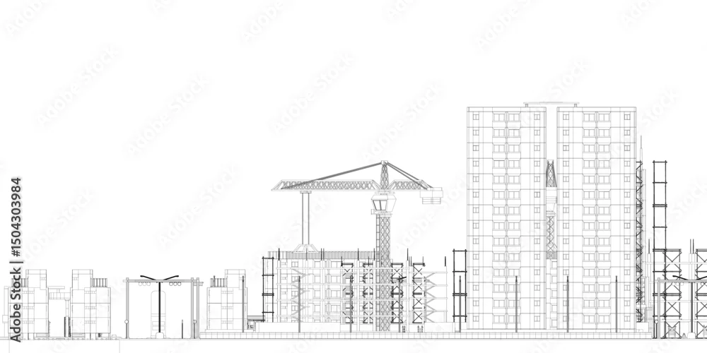 Fototapeta samoprzylepna A drawing of a city skyline with a large building in the middle. The drawing is in black and white and has a very clean and simple style. The mood of the drawing is calm and peaceful