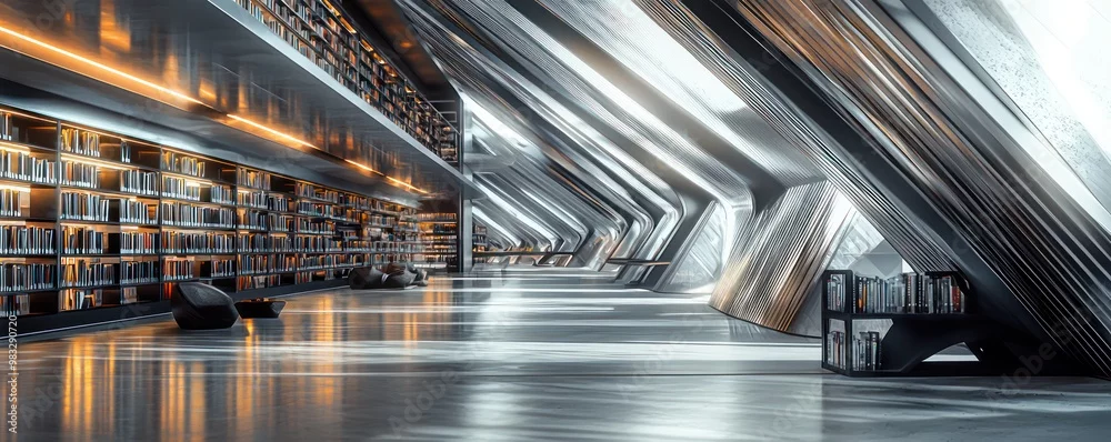 Fototapeta samoprzylepna An architectural design for a futuristic library with walls of aluminum siding that automatically adjust their opacity to control light and temperature inside