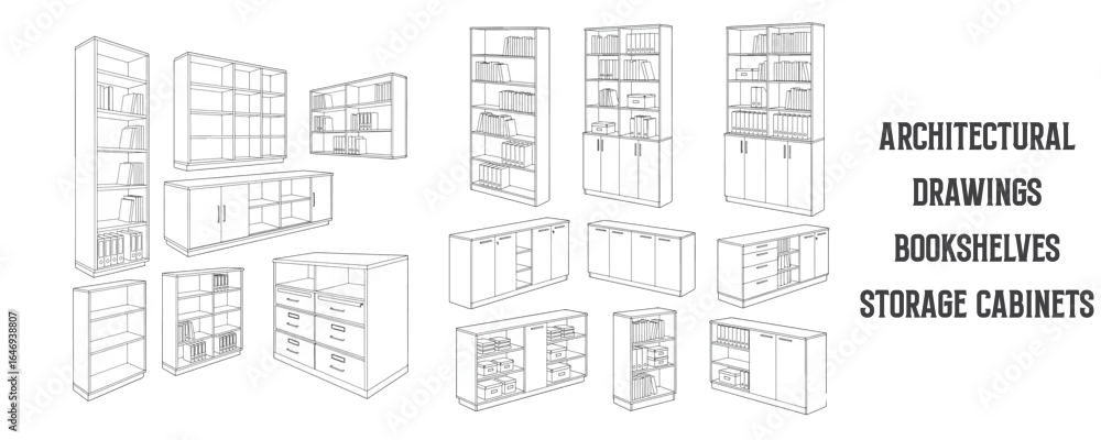 Fototapeta samoprzylepna Architectural line drawings of bookshelves and storage cabinets for office spaces in minimal black and white vector style for interior design and workspace layouts