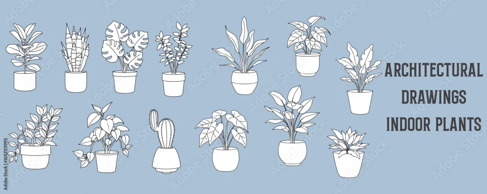 Fototapeta samoprzylepna Architectural line drawings of indoor plants in simple pots, minimalist black and white vector illustration for modern interior design and architectural presentations