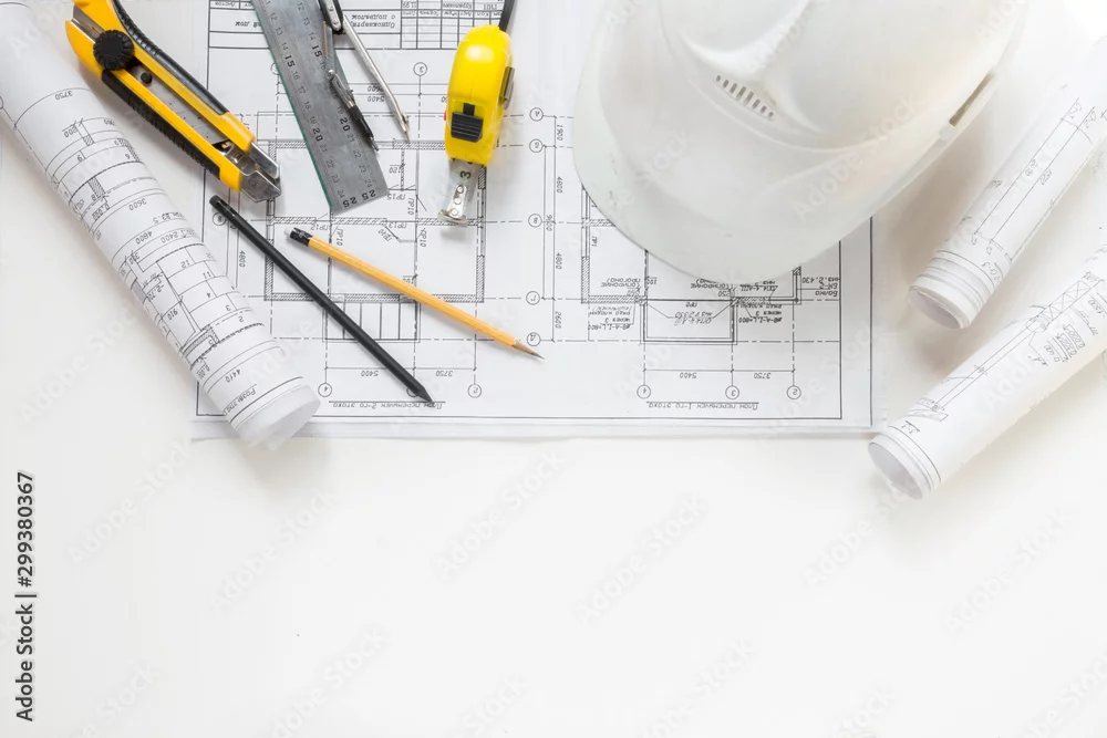 Fototapeta samoprzylepna architekt projekt działający rysunek szkic plany plany i wykonanie modelu konstrukcji architektonicznej w pracowni architekta, płaski długi baner