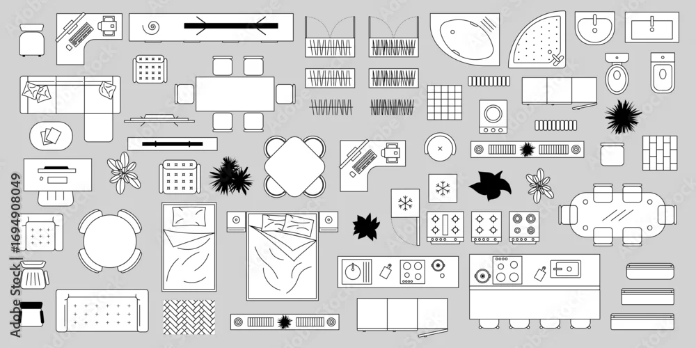 Collection of minimalist furniture outline icons in black and white, ideal for interior design layouts and architectural plans. Furniture outline top view