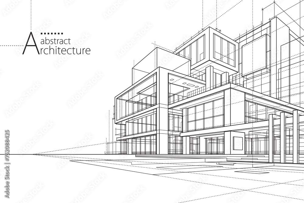 Fototapeta samoprzylepna 3D illustration, abstract modern urban landscape line drawing, imaginative architecture building construction perspective design.