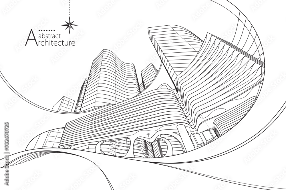 Fototapeta samoprzylepna 3D illustration, abstract modern urban landscape line drawing, imaginative architecture building construction perspective design.