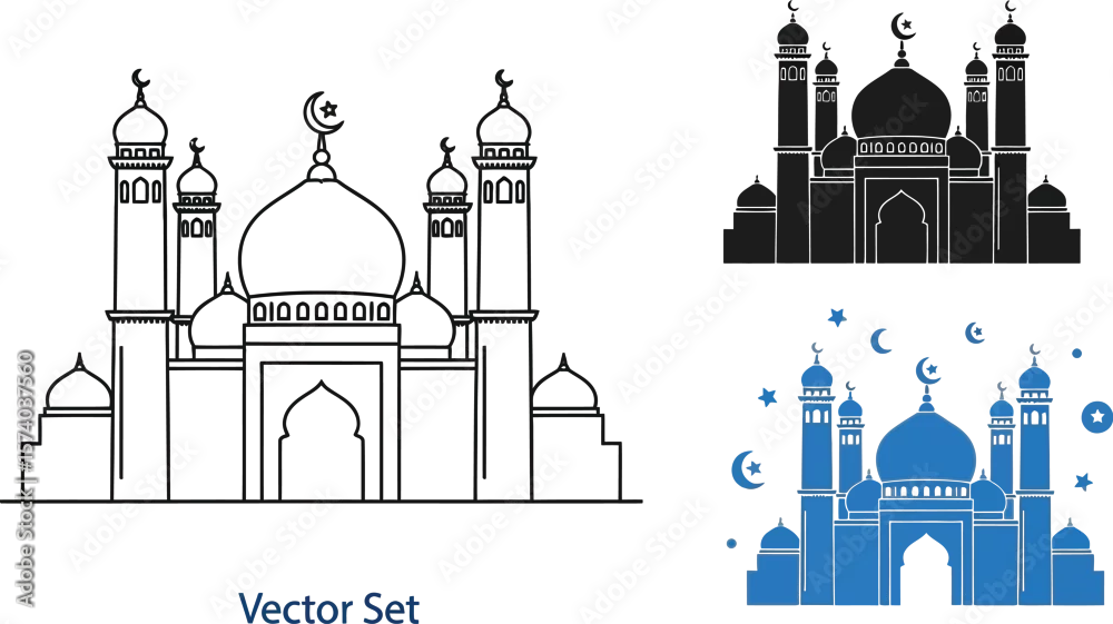 Fototapeta samoprzylepna detailed architectural drawing of a grand islamic mosque, intricate domed structure with minarets, ornate design with decorative arches and domes, black and white line art, vector illustration