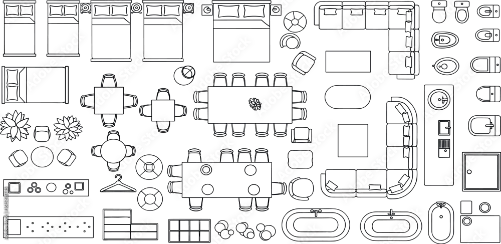 Furniture outline top view. Floor plan icons set for design interior and architectural project. Furniture thin line icon in top view for layout.