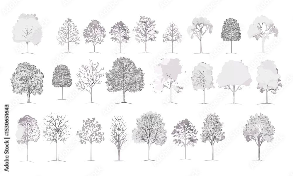 Minimal tree line vector illustration, architectural drawing style, cad element for landscaping, white stroke, foliage symbol, nature blueprint, background pattern, garden sketch.