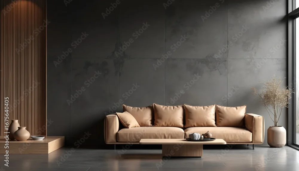 Minimalist living room features light brown sofa against dark gray concrete wall. Light brown wooden coffee table with decorative items sits in front of couch. Modern interior design offers sense of
