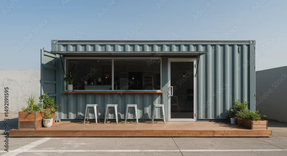 Fototapeta samoprzylepna Modern shipping container cafe with outdoor seating and plants in a sunny environment