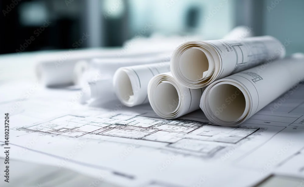 Fototapeta samoprzylepna Rolled architectural blueprints stacked on top of floor plans in a modern office setting.