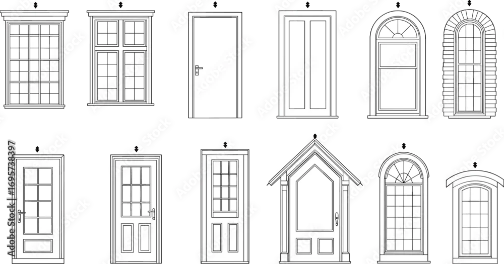 Set of house doors and windows, detailed architectural elements, classic building design, line art, cad drawing flat vector illustration, construction