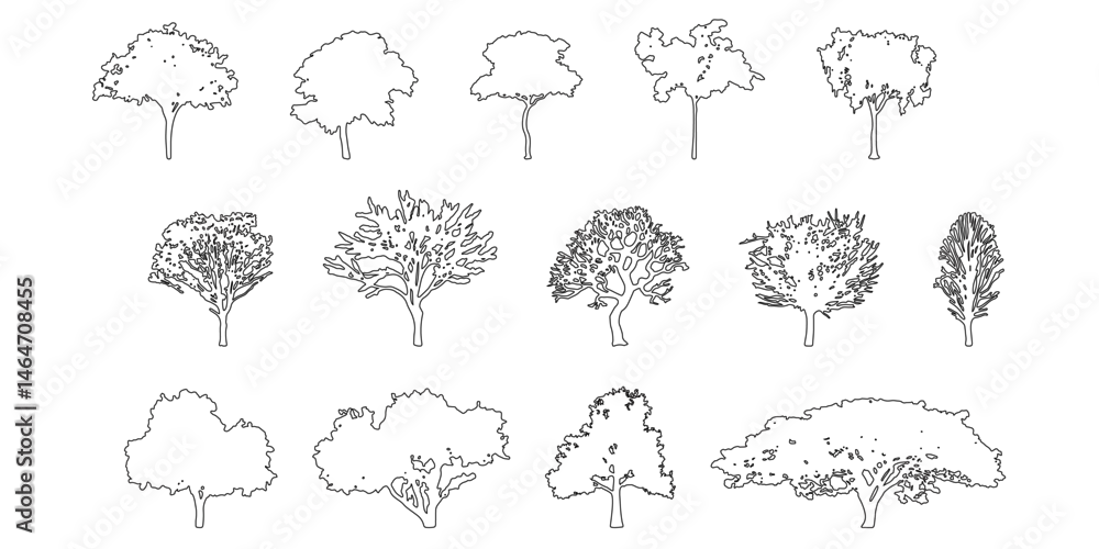 Fototapeta samoprzylepna silhouette tree line drawing set, Side view, set of graphics trees elements outline symbol for architecture and landscape design drawing. Vector illustration in stroke fill in white. Tropical