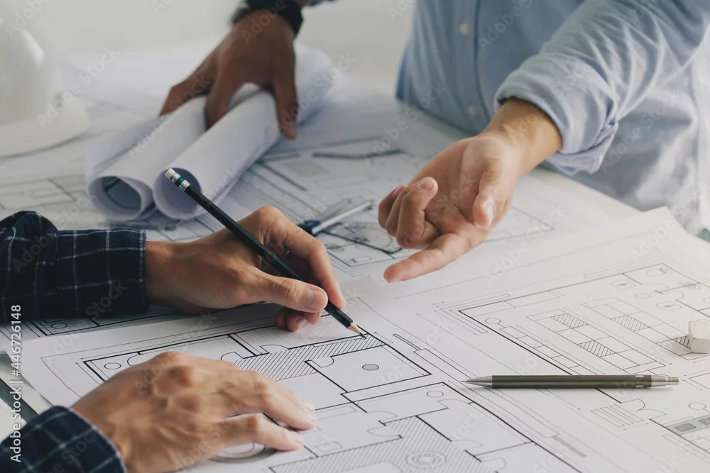 Two business man construction site engineers. working drawing on blueprint and discussing the floor plans over blueprint architectural plans at table in a modern office. construction concept