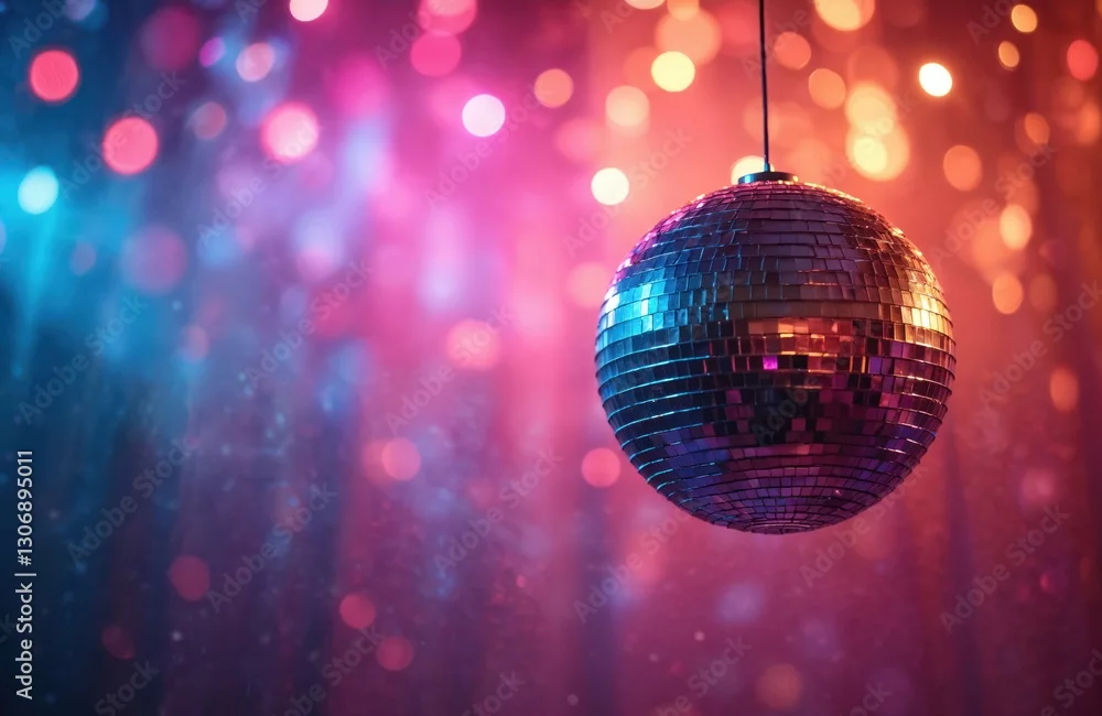 Abstract background with bokeh and disco ball. Party light sphere in club reflect mirror night design. Shiny colors globe celebration nightlife. Perfect design element for holiday.
