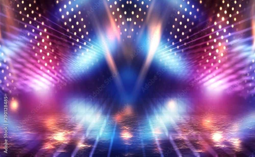 Fototapeta samoprzylepna Abstrakcyjne tło. Ciemna pusta scena, wielokolorowe promienie reflektora neonowego, mokry asfalt, dym, strzelanie nocne, kolor bokeh.