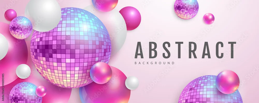 3D abstract background with holographic pink spheres and disco ball spheres. Disco ball background. Disco party poster. Vector illustration