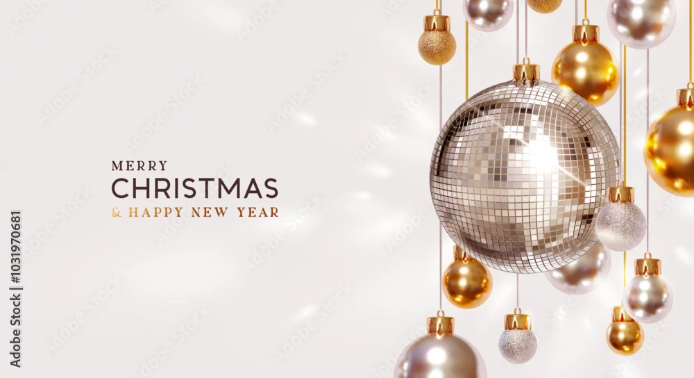 Merry Christmas and Happy New Year background. Realistic 3d disco ball silver glitter mirrors, hang on ribbon golden and silver Christmas ornaments. Vector illustration