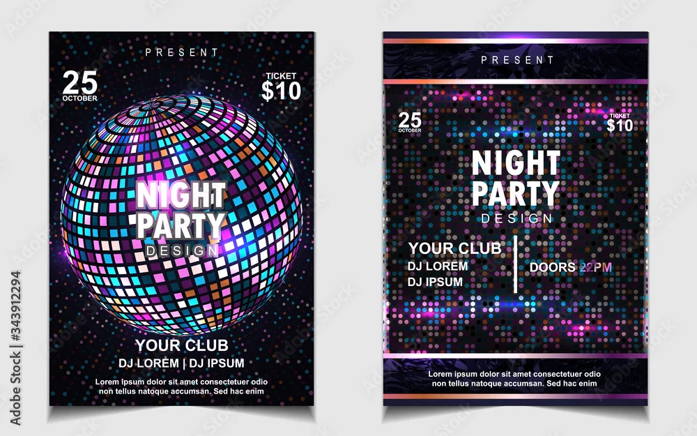 Night dance party music layout cover design template background with colorfu dark blue glitters style. Light electro vector for music event concert disco, club invitation, festival poster, flyer