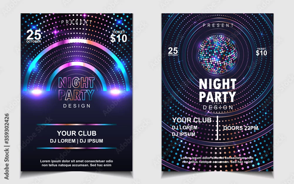 Night dance party music poster flyer layout design template background with neon light and dynamic style. Colorful electro style vector for concert disco, club party, event invitation, cover festival