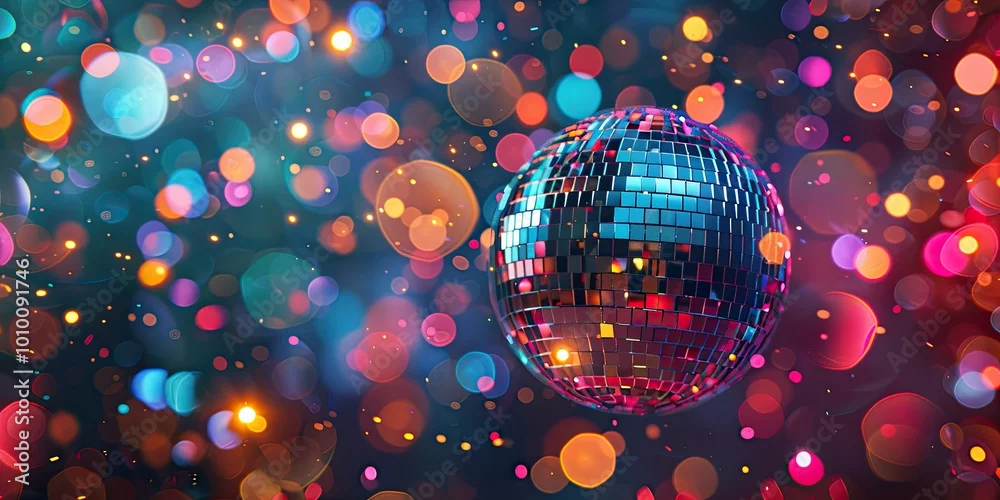 Fototapeta samoprzylepna Shiny disco ball reflecting colorful lights, creating a party atmosphere with glowing bokeh effects.