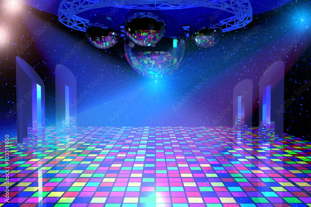 Fototapeta samoprzylepna Tło świateł dyskotekowych z lustrzanymi kulkami, chromowaną kratą i błyszczącymi gwiazdami. 3d ilustracji.
